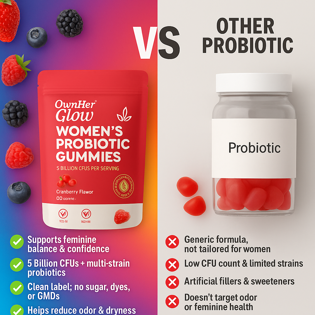 "I was getting UTIs every month. After 6 weeks on Own Her Glow, I haven't had a single one. The cranberry + probiotics combo is perfect."